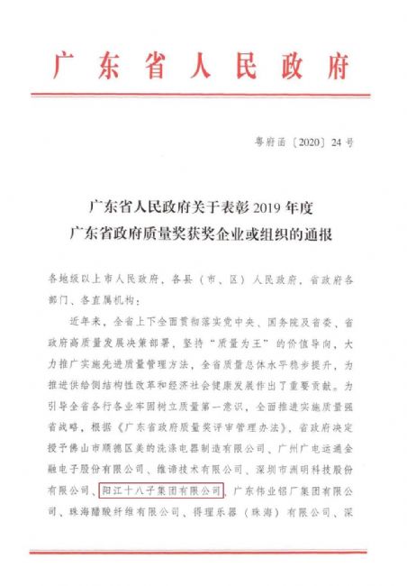 近日,廣東省人民政府發布了《關于表彰2019年度廣東省政府質量獎獲獎企業或組織的通報》,10家企業榮獲2019年度廣東省政府質量獎,其中,陽江十八子集團有限公司榮膺上榜,成為廣東粵西地區首家獲此殊榮的企業。