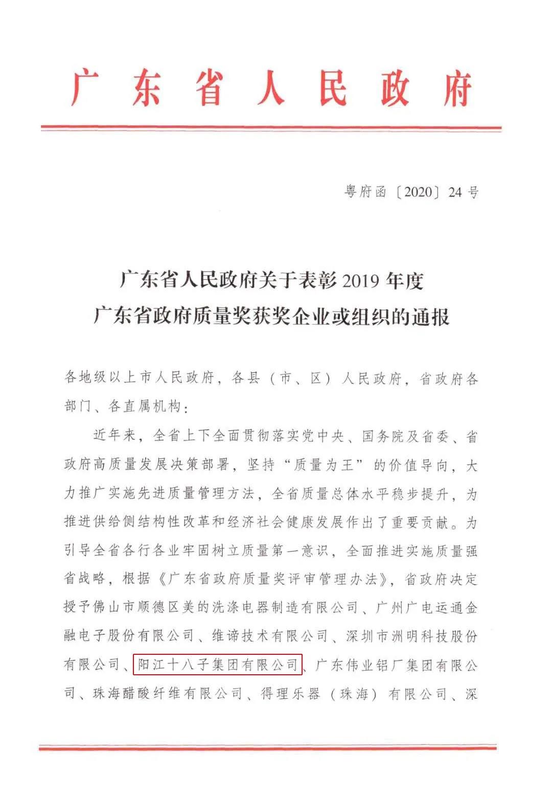 近日,廣東省人民政府發布了《關于表彰2019年度廣東省政府質量獎獲獎企業或組織的通報》,10家企業榮獲2019年度廣東省政府質量獎,其中,陽江十八子集團有限公司榮膺上榜,成為廣東粵西地區首家獲此殊榮的企業。