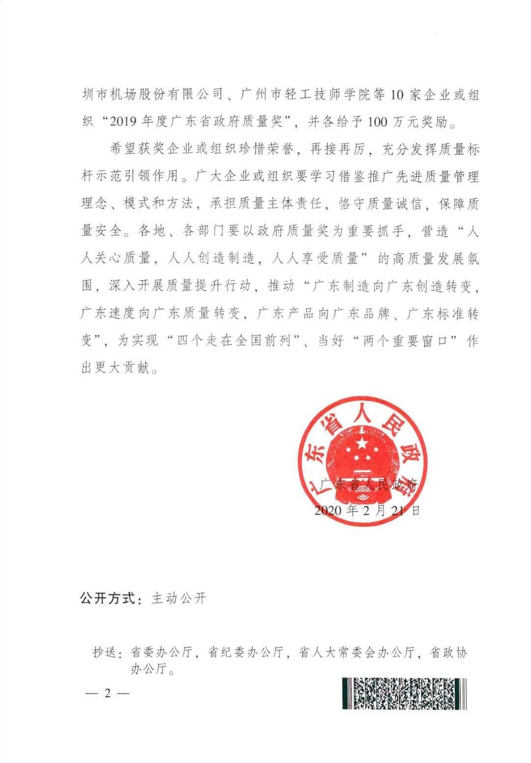 廣東省政府質量是省政府設立的廣東省最高質量獎項,授予質量管理成效顯著,產品、服務和經營質量、自主創新能力和市場競爭力等在國內外處于領先地位,對全省經濟社會發展作出卓越貢獻的企業或組織。據悉,廣東省政府質量獎評選條件相當嚴苛,須通過組織推薦、材料初審到評審組現場評審、實地考察、綜合評價層層“關卡”。一個企業能最終榮獲這一金字招牌,意味著這個企業在全省乃至全國的品質管控領域具備過硬實力和一定的影響力。